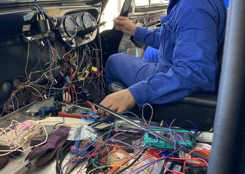 1969年製とかなり古い車両なので、配線トラブルを避けるために車両に付いている全ての配線を取外し、配線図を作り直し、電気系統の配線を一新します。